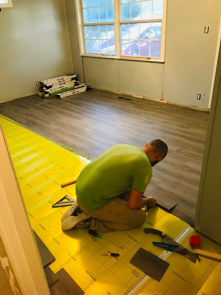 Once your all geared up and ready to go, I suggest watching a couple of YouTube videos to get yourself familiar with the process. Danny watched a helpful YouTube video to see how to lay flooring called “Fix This Build That“, “How to Install Vinyl Plank Flooring as a Beginner | Home Renovation” https://www.youtube.com/watch?v=6KEthELQfro
