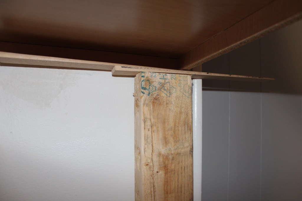 After you find your studs put a small mark on the wall underneath the line where the bottom of the cabinet will sit. Make sure to have your level, drill and screws ready to go. Once you have the cabinet up on the 2×4’s you will still need to hold the front of the cabinet up, so your doing all of this with one hand.