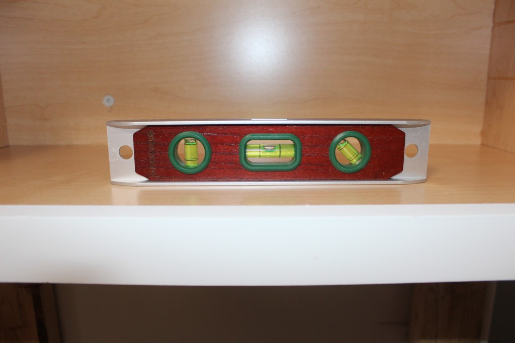 Lift the cabinet up onto the two 2x4s that you placed against the wall. Tilt the cabinet back against the wall and grab your level while keeping pressure on the front of the cabinet to keep it against the wall. Open up one of the doors and place the level inside of the the cabinet. If the cabinet needs to be raised on one end to make it level, I like to use a wood shim. Once you have the cabinet level, grab your drill and put the screw on the bit. (A magnetic bit driver really helps in this scenario.)