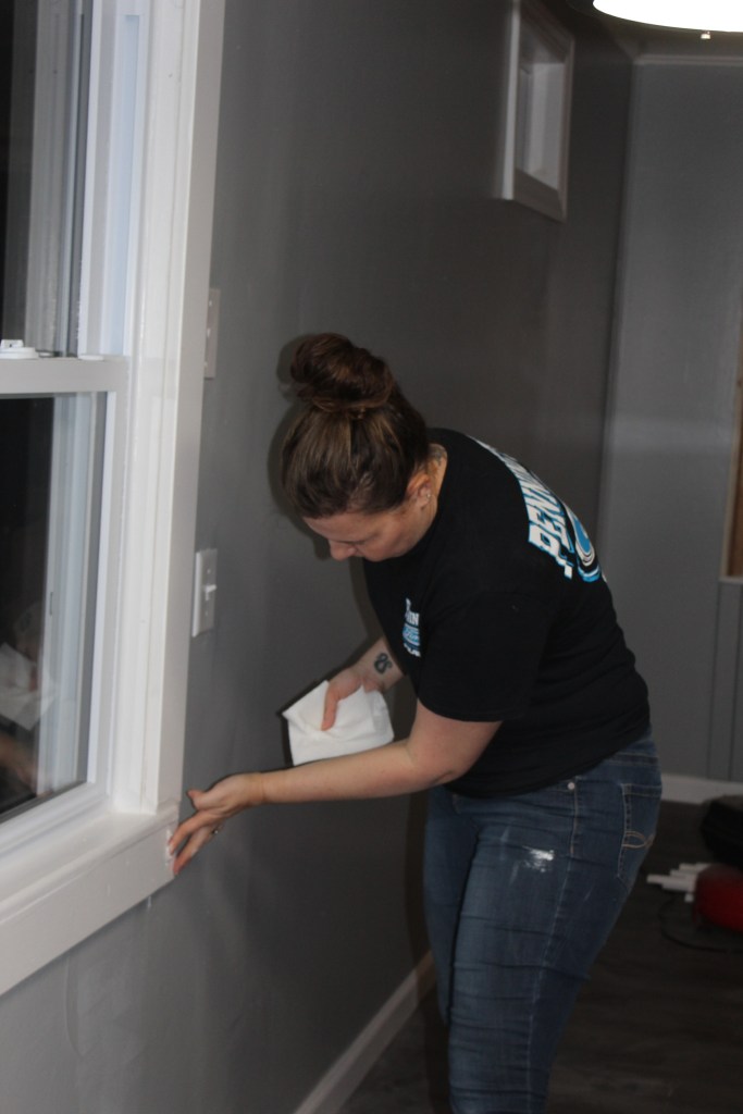 Teamwork makes the dream work. Zella always comes in behind me after I have the baseboards or window frames installed and caulks over the seams and fills in the nail holes. Once the seams and holes are caulked, the flooring and walls really look complete!