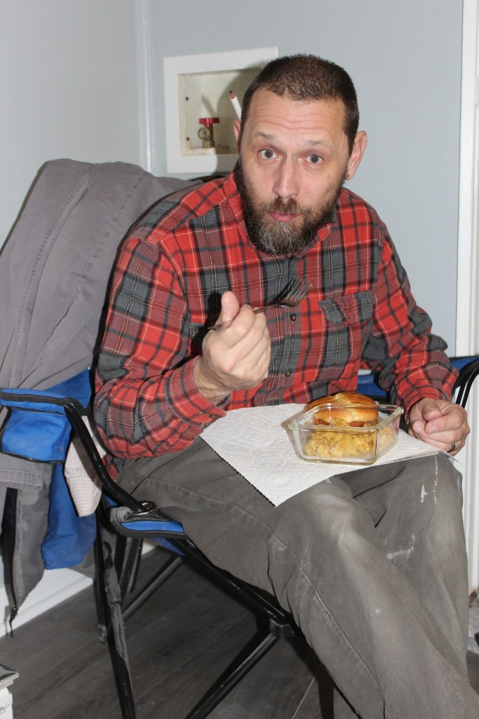 Danny goes straight to the property after work, changes out of his work clothes, and gets started on the rental renovation. Once I meet him at the house, we eat dinner together, I change and also get to work .