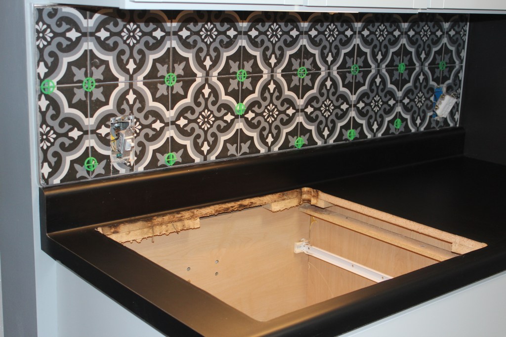 Onto kitchen backsplash! We used 8X8 Mohawk “Montrose” tiles from Menards. We love putting REAL backsplash up in the kitchen to bring the “quality” of the home to a higher standard. No peel and stick or cheap stuff here!