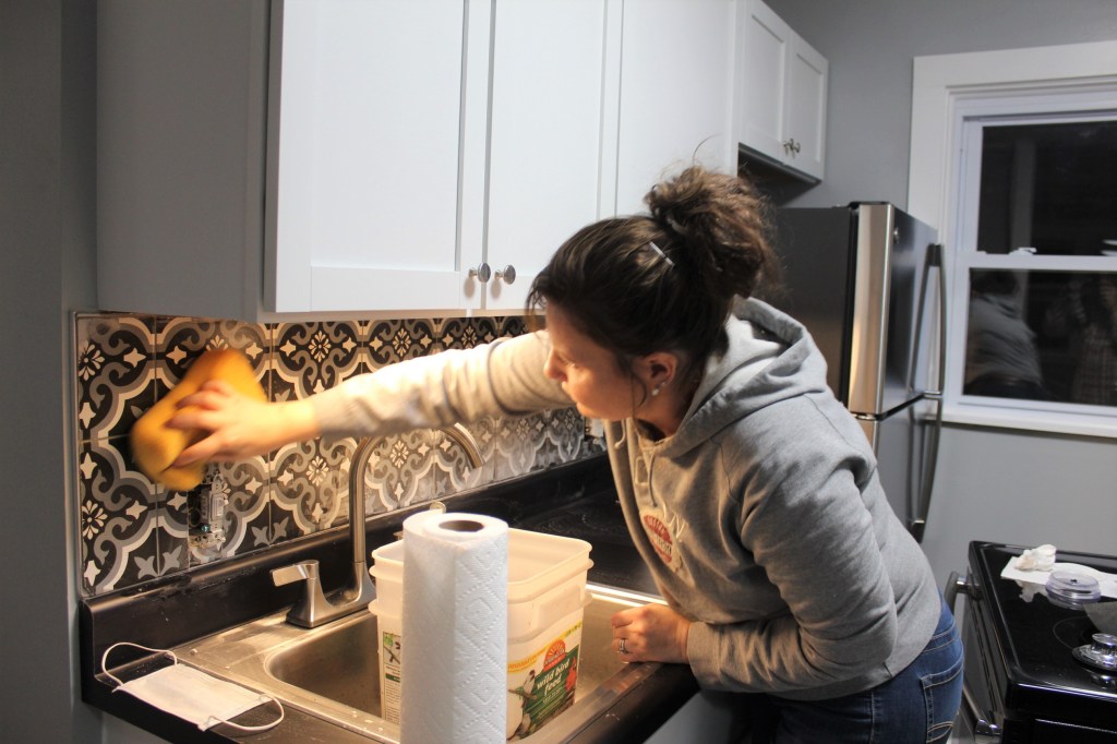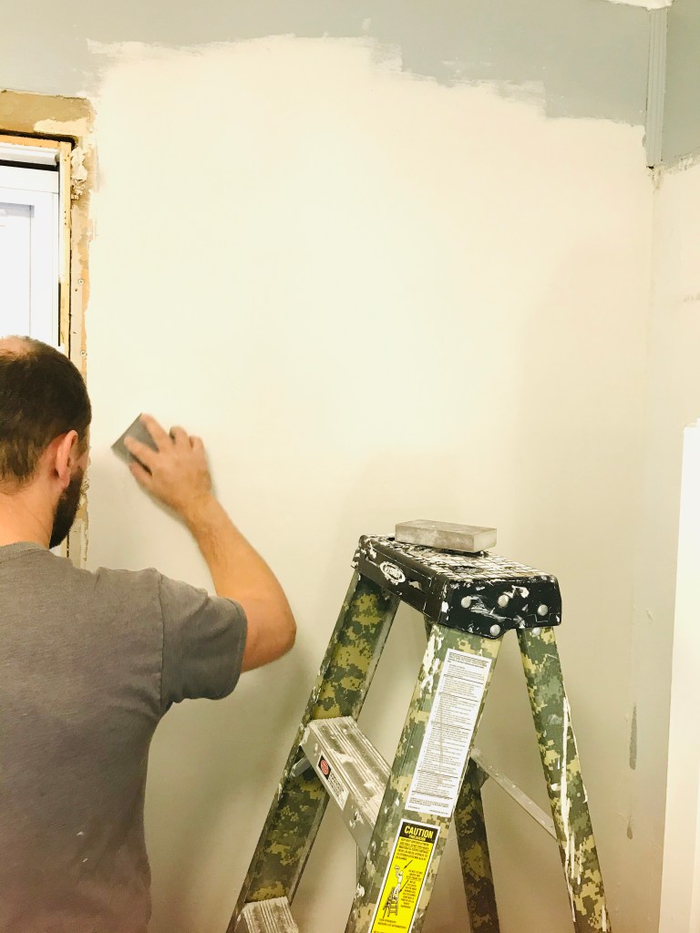 We didn’t pay attention to the fact that the cabinets and counter tops before did not extend to the wall, but stopped about 6in short. In only measuring previous cabinets at 18in we failed to consider they wouldn’t be up against the wall. Thus, Danny had to add a skim-coat on the wall because it is exposed and needed a lot of work to smooth it out. With a wall that was full of divots, scrapes, nail holes, and marks it just made sense to give the wall a new top coat. A few of coats of drywall mud and the wall looks 100% better!