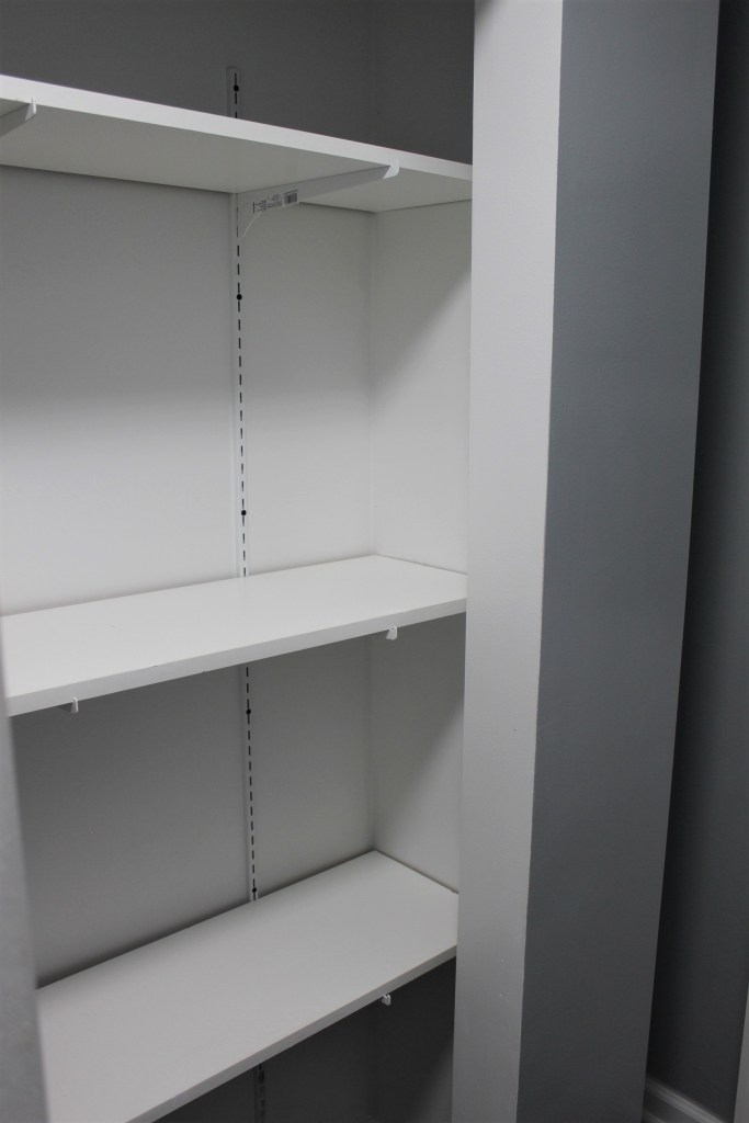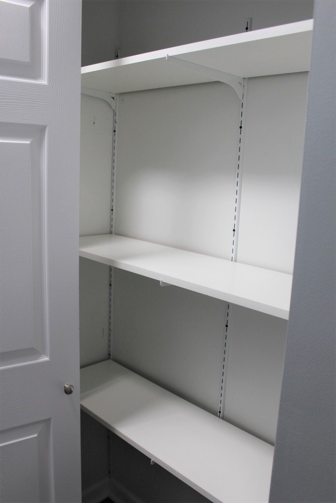 I mounted the tracks on the studs in the closet, cut the shelves to fit inside and mounted them using the shelf brackets.