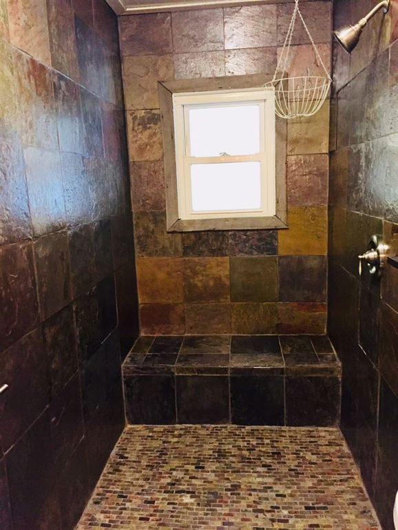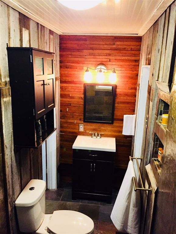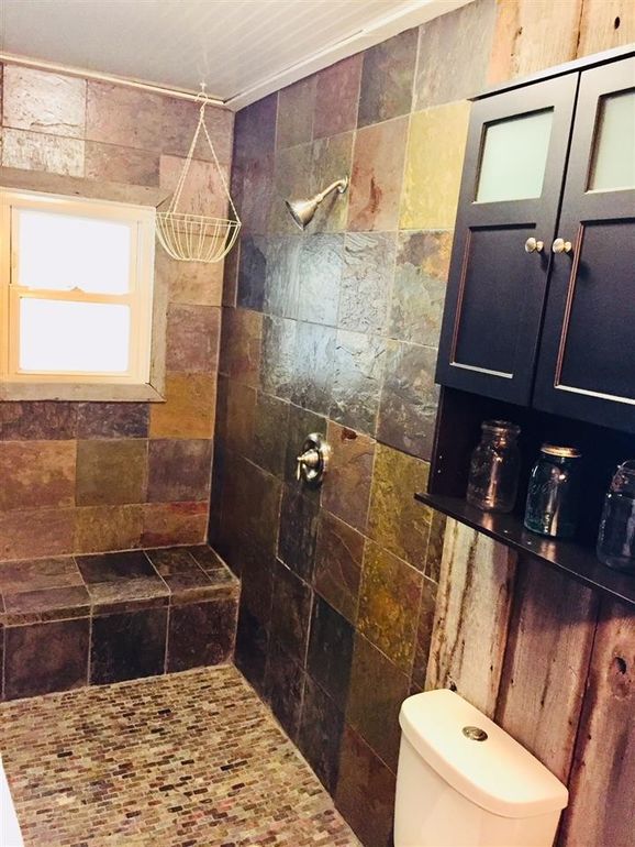 This bathroom was 4 ft by 11 ft (Jack and Jill style) and we decided on a walk in shower, all tile. We wanted it to look rustic with different wood types. We had some old barn wood and used lath wood that was behind the drywall when tearing the walls out. Bead board was used on the ceiling with old 1X3 strips, painted white.