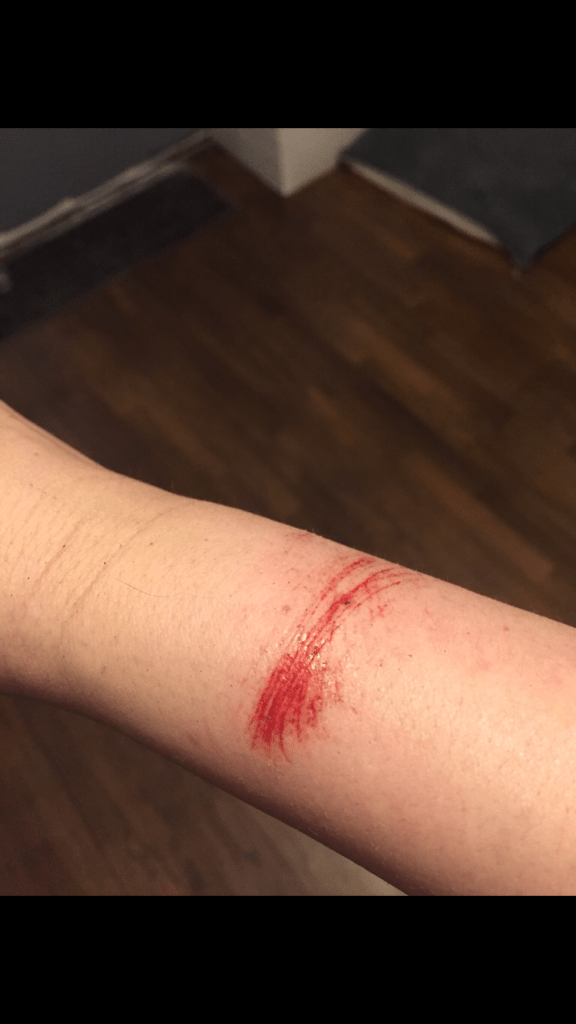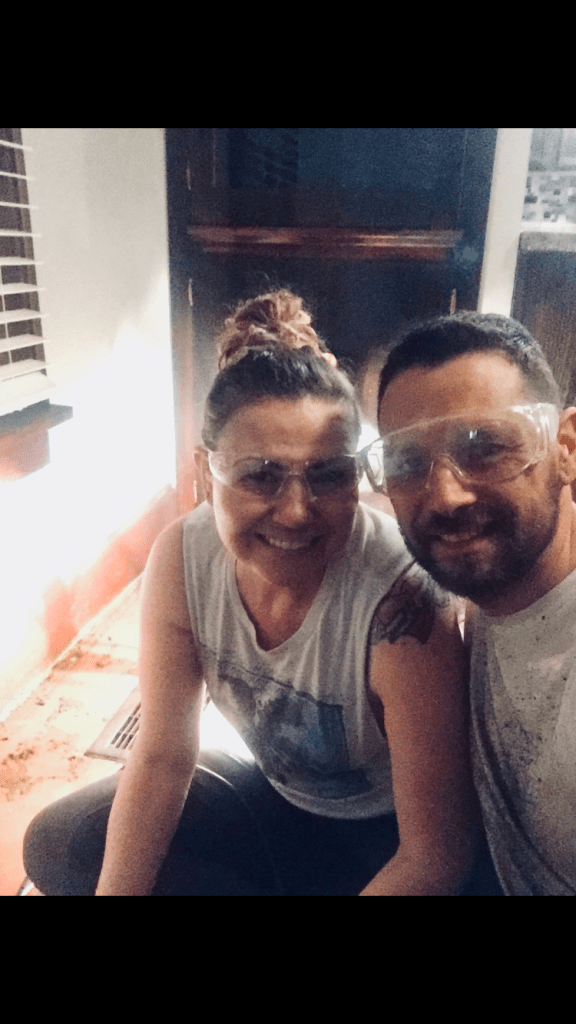 So, this could have been a lot worse than it was, but was quite scary! We were using the drills with the trigger lock on and while using the wire wheel, it got caught in my shirt and it was wrapping around my shirt quickly! In a panic mode, I tried to pull it off of me while the wheel was still running up my front. In Danny’s quick thinking, he reached for the power cord and unplugged it! I still have the scar today on my arm as a reminder of being careful when using power tools. It also made me take the precaution of pulling my hair up as well so that it never gets caught in anything!