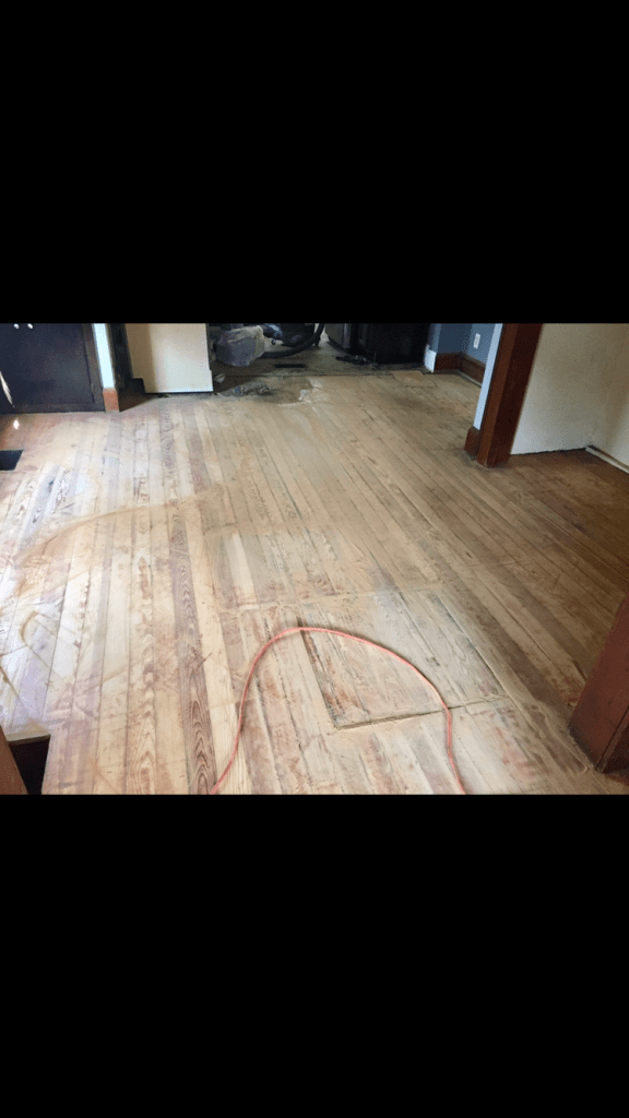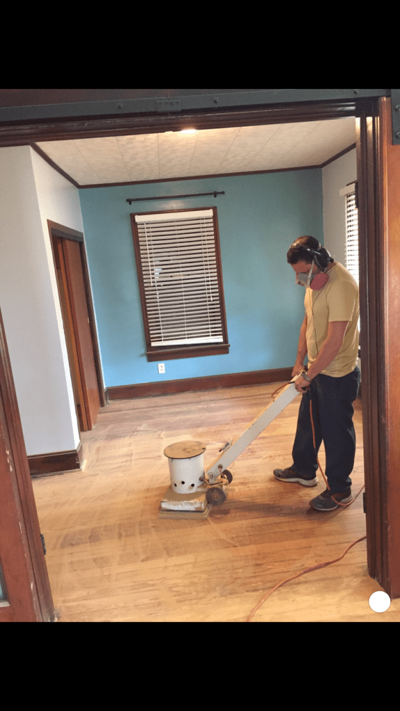 We had moved out of the house on Sunset at this point and had moved into our next live in flip. (Stay tuned for some really great stories on the Southside project house!) This made refinishing the floors a lot easier as the house was completely vacant and the floors had no furniture to work around. We would get home from work, eat dinner, change and head over to spend a few hours working on the floors in the evening. There was at least a week trying to get the tar paper off, but we knew we just had to get this done so we could move on.