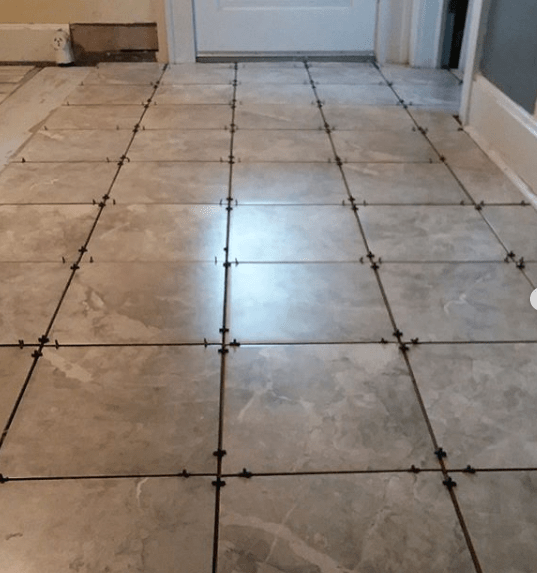 Danny installed Hardy Backer Board on the floors and got to work laying tile the following day. Laying the tile went pretty quick as there weren’t a lot of cuts to make. The trick on this floor was the lines. We had to have good straight lines as you could see the kitchen floor from the living room. Danny used 3/8 inch tile spacers from MD Building Products to get the tiles to lay straight.